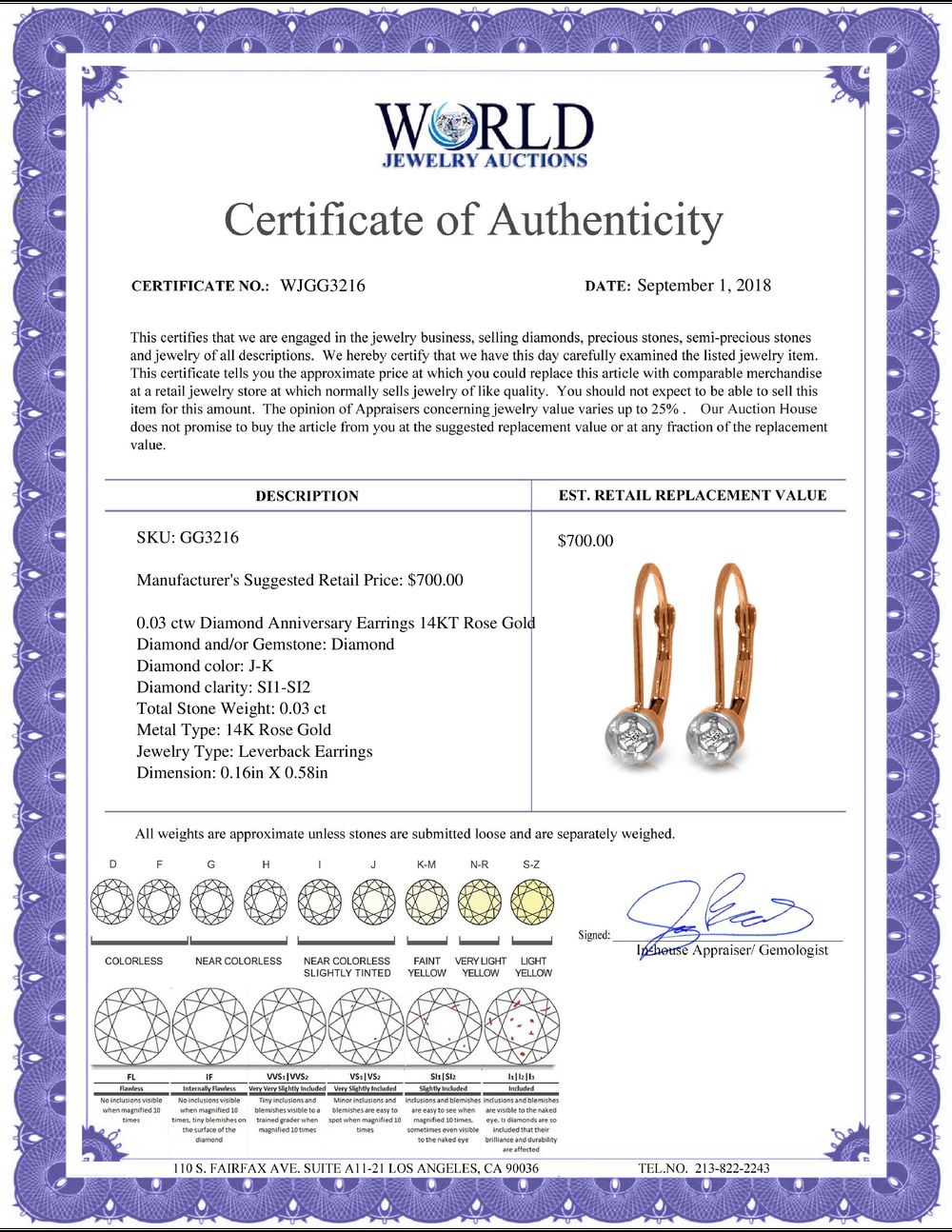 WORLD JEWELRY AUCTION believes to the best of its knowledge that the information presented in any listing has come from reliable sources. Such information is presented solely for the convenience of the Purchaser. WJA makes no warranties of any kind related to the information presented in any listing. WJA further makes no warranties, either express or implied, relating to the value, marketability or condition of the lot described in any listing. Prospective bidders should investigate a lot thoroughly before bidding. By bidding the Bidder acknowledges that Bidder has investigated the lot to his or her satisfaction, or, that Bidder has chosen not to do so, and agrees to accept the lot being bid on with no objections after the sale closes. If you are uncertain please contact us with your questions prior to bidding. If you are still uncertain after we reply, please refrain from bidding. Photos other graphic material contained in any listing of generic or duplicate lots may be stock presentations and not necessarily of the specific lot.