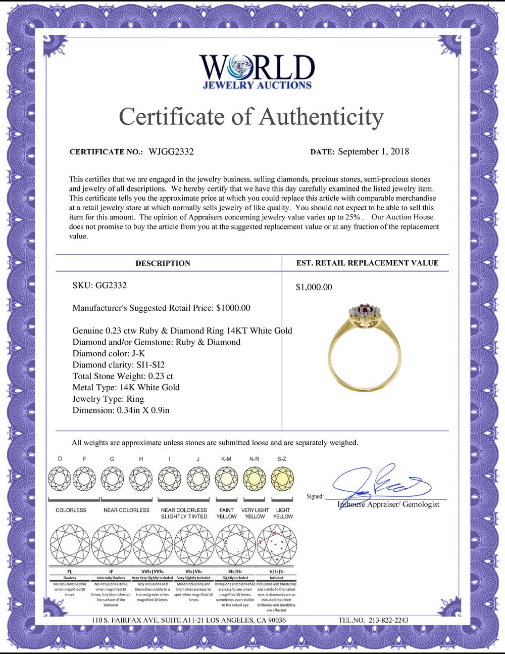 WORLD JEWELRY AUCTION believes to the best of its knowledge that the information presented in any listing has come from reliable sources. Such information is presented solely for the convenience of the Purchaser. WJA makes no warranties of any kind related to the information presented in any listing. WJA further makes no warranties, either express or implied, relating to the value, marketability or condition of the lot described in any listing. Prospective bidders should investigate a lot thoroughly before bidding. By bidding the Bidder acknowledges that Bidder has investigated the lot to his or her satisfaction, or, that Bidder has chosen not to do so, and agrees to accept the lot being bid on with no objections after the sale closes. If you are uncertain please contact us with your questions prior to bidding. If you are still uncertain after we reply, please refrain from bidding. Photos other graphic material contained in any listing of generic or duplicate lots may be stock presentations and not necessarily of the specific lot.