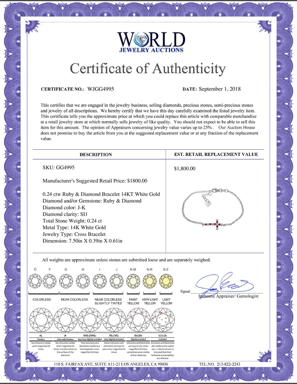 WORLD JEWELRY AUCTION believes to the best of its knowledge that the information presented in any listing has come from reliable sources. Such information is presented solely for the convenience of the Purchaser. WJA makes no warranties of any kind related to the information presented in any listing. WJA further makes no warranties, either express or implied, relating to the value, marketability or condition of the lot described in any listing. Prospective bidders should investigate a lot thoroughly before bidding. By bidding the Bidder acknowledges that Bidder has investigated the lot to his or her satisfaction, or, that Bidder has chosen not to do so, and agrees to accept the lot being bid on with no objections after the sale closes. If you are uncertain please contact us with your questions prior to bidding. If you are still uncertain after we reply, please refrain from bidding. Photos other graphic material contained in any listing of generic or duplicate lots may be stock presentations and not necessarily of the specific lot.