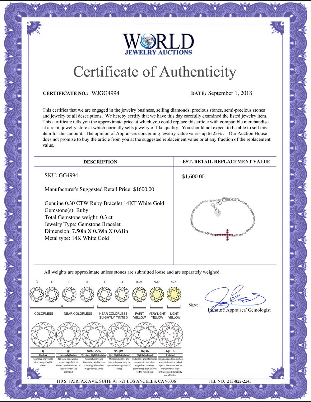 WORLD JEWELRY AUCTION believes to the best of its knowledge that the information presented in any listing has come from reliable sources. Such information is presented solely for the convenience of the Purchaser. WJA makes no warranties of any kind related to the information presented in any listing. WJA further makes no warranties, either express or implied, relating to the value, marketability or condition of the lot described in any listing. Prospective bidders should investigate a lot thoroughly before bidding. By bidding the Bidder acknowledges that Bidder has investigated the lot to his or her satisfaction, or, that Bidder has chosen not to do so, and agrees to accept the lot being bid on with no objections after the sale closes. If you are uncertain please contact us with your questions prior to bidding. If you are still uncertain after we reply, please refrain from bidding. Photos other graphic material contained in any listing of generic or duplicate lots may be stock presentations and not necessarily of the specific lot.