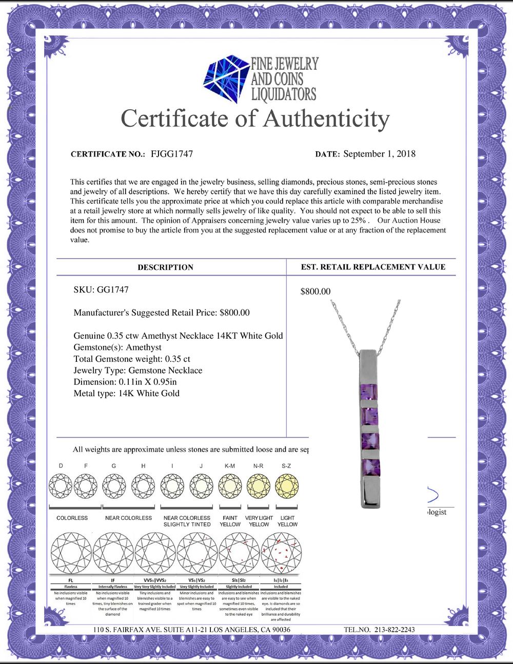 REF-26N6R - SKU: GG1747 ---- Genuine 0.35 ctw Amethyst Necklace 14KT White Gold