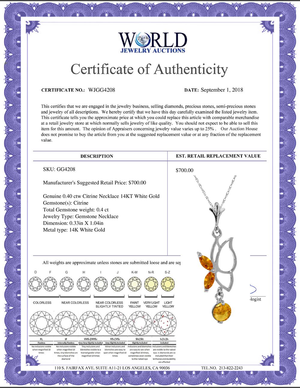 All property is sold “AS IS”, and ALL SALES ARE FINAL. Property is open to thorough public inspection. It is the Bidder’s responsibility to determine condition, age, genuineness, value or any other determinative factor. WJA may attempt to describe the merchandise in advertising and on the Internet but makes no representations. In no event shall WORLD JEWELRY AUCTION be held responsible for having made or implied any warranty of merchantability or fitness for a particular purpose. Bidder shall be the sole judge of value.
