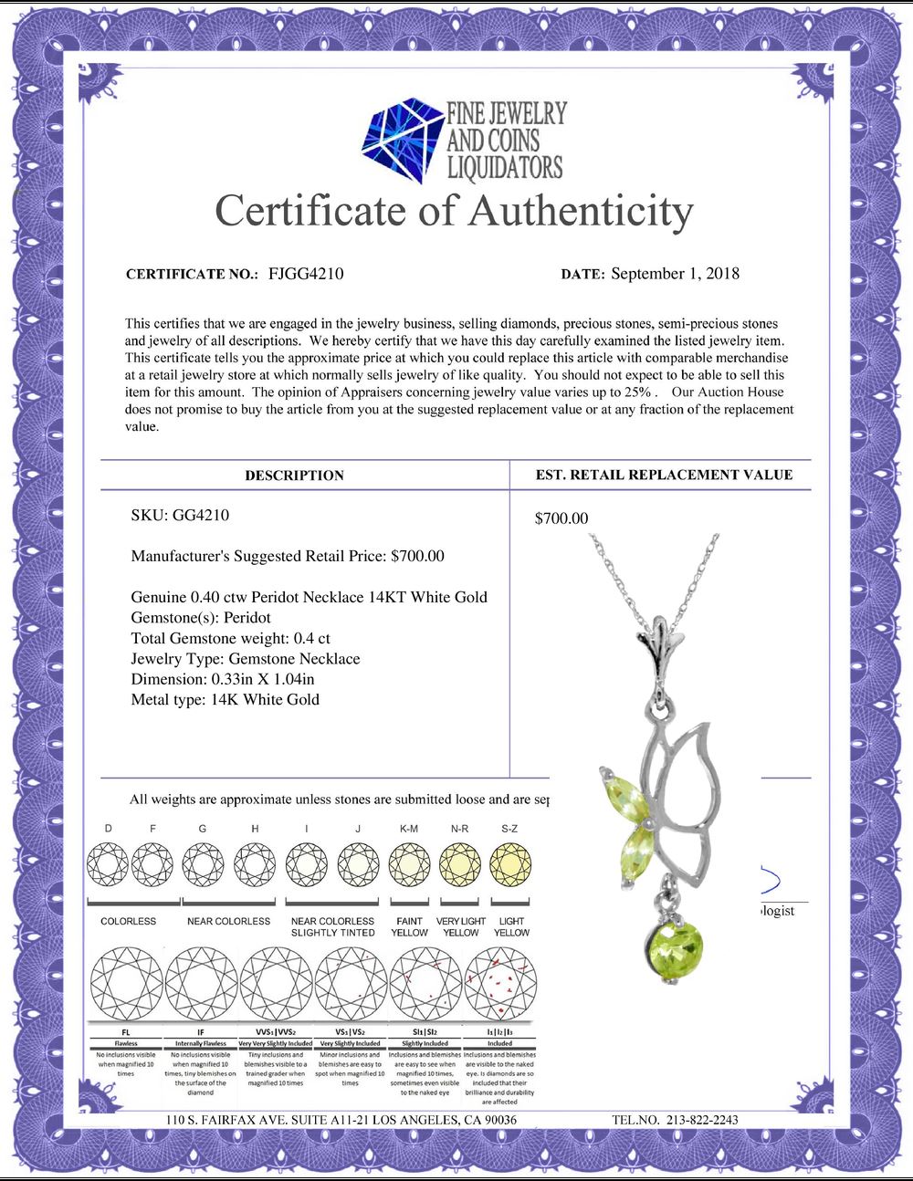 REF-22V2W - SKU: GG4210 ---- Genuine 0.40 ctw Peridot Necklace 14KT White Gold