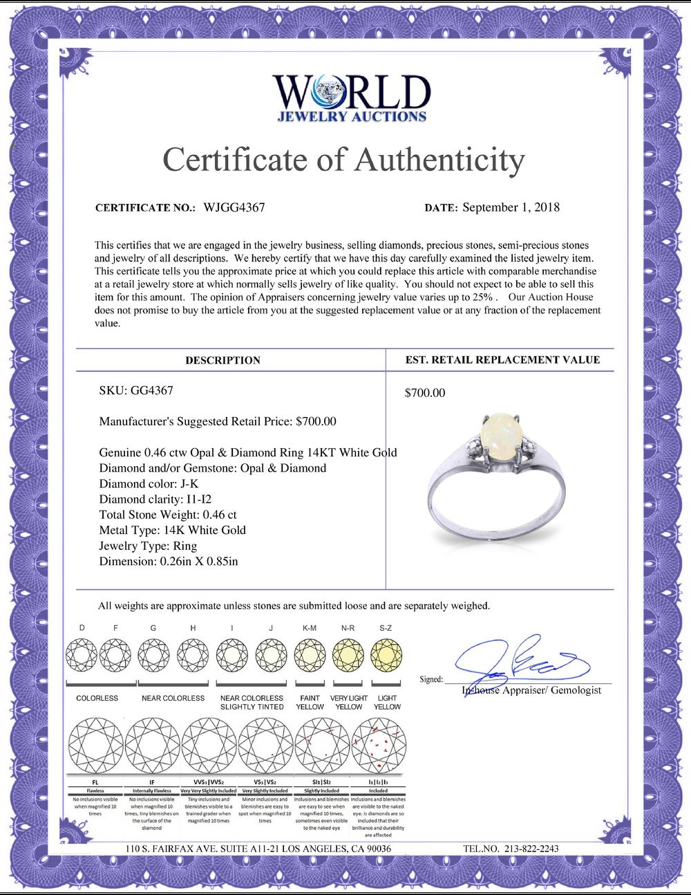 WORLD JEWELRY AUCTION believes to the best of its knowledge that the information presented in any listing has come from reliable sources. Such information is presented solely for the convenience of the Purchaser. WJA makes no warranties of any kind related to the information presented in any listing. WJA further makes no warranties, either express or implied, relating to the value, marketability or condition of the lot described in any listing. Prospective bidders should investigate a lot thoroughly before bidding. By bidding the Bidder acknowledges that Bidder has investigated the lot to his or her satisfaction, or, that Bidder has chosen not to do so, and agrees to accept the lot being bid on with no objections after the sale closes. If you are uncertain please contact us with your questions prior to bidding. If you are still uncertain after we reply, please refrain from bidding. Photos other graphic material contained in any listing of generic or duplicate lots may be stock presentations and not necessarily of the specific lot.