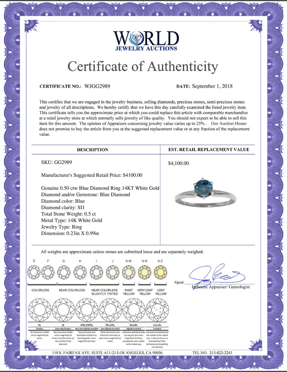 REF-135P8H - SKU: GG2989 ---- Genuine 0.50 ctw Blue Diamond Ring 14KT White Gold