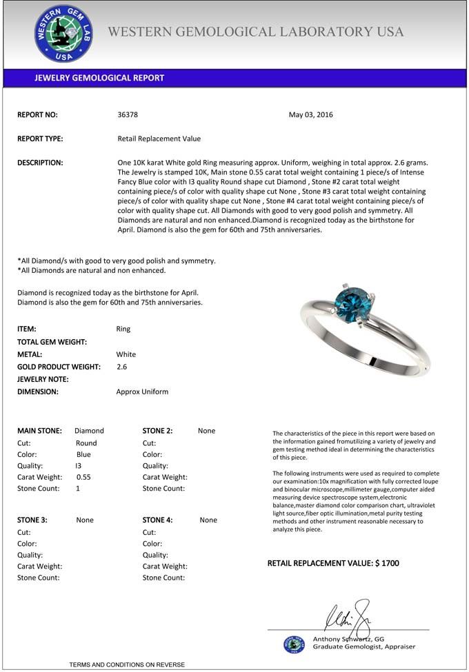 total approx. 2.6 grams. The Jewelry is stamped 10K, Main stone 0.55 carat total weight containing 1 piece/s of Intense Fancy Blue color with