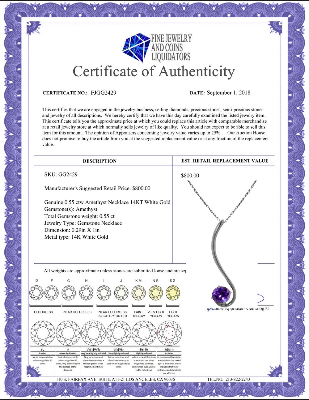 REF-26P2H - SKU: GG2429 ---- Genuine 0.55 ctw Amethyst Necklace 14KT White Gold