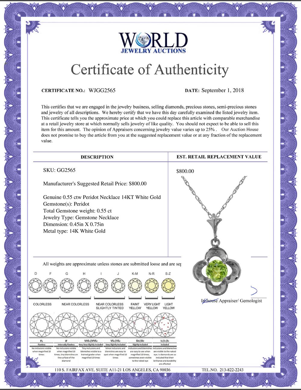 REF-23F6Z - SKU: GG2565 ---- Genuine 0.55 ctw Peridot Necklace 14KT White Gold
