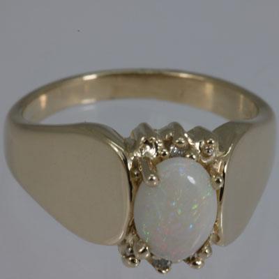 Main Stone: Diamond ; Type: Ring ; Diamond Count 1: 4RD ; Diamond Weight 1: 0.06 ; Diamond Count 2: ; Gemstone: 1Opal ; Gemstone Weight: 0.5 ; Metal Purity: 10KT ; Metal: Yellow Gold ; Diamond Clarity: SI2 ; Diamond Color: H-J ; Weight(g): 5.66g ; Ring Size: 6.5
