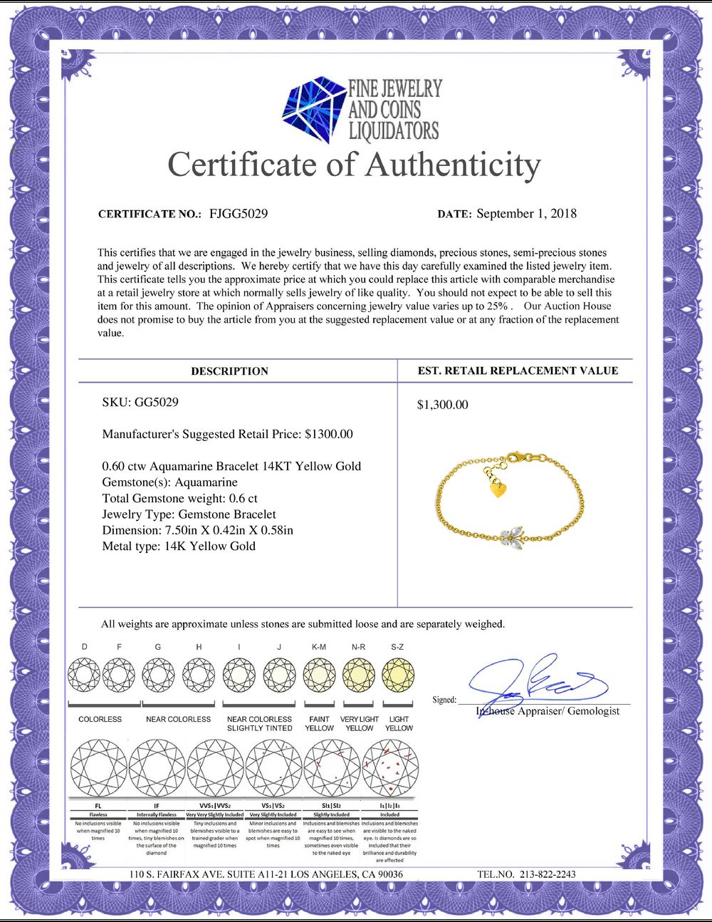 REF-42R7P - SKU: GG5029 ---- Genuine 0.60 ctw Aquamarine Bracelet 14KT Yellow Gold