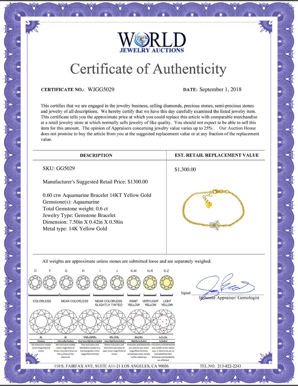 All property is sold “AS IS”, and ALL SALES ARE FINAL. Property is open to thorough public inspection. It is the Bidder’s responsibility to determine condition, age, genuineness, value or any other determinative factor. WJA may attempt to describe the merchandise in advertising and on the Internet but makes no representations. In no event shall WORLD JEWELRY AUCTION be held responsible for having made or implied any warranty of merchantability or fitness for a particular purpose. Bidder shall be the sole judge of value.