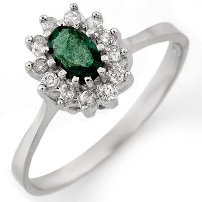 Diamond: 12 Round cut @ 0.20 ctw Clarity: SI-I Color: H-K Gemstone: Natural Emerald Gemstone color: Green Gemstone quality: Good-to-Very Good Gemstone Cut & Weight: 1 Oval cut @ 0.40 ctw Metal Purity & Color : 14K Gold-White Gold weight: 3.15 grams Ring size (US): 6.75 Dimension: Approx. 5/16" x 1/4" Consignor: World Jewelry Outlet Delivery: Within 10 business days
