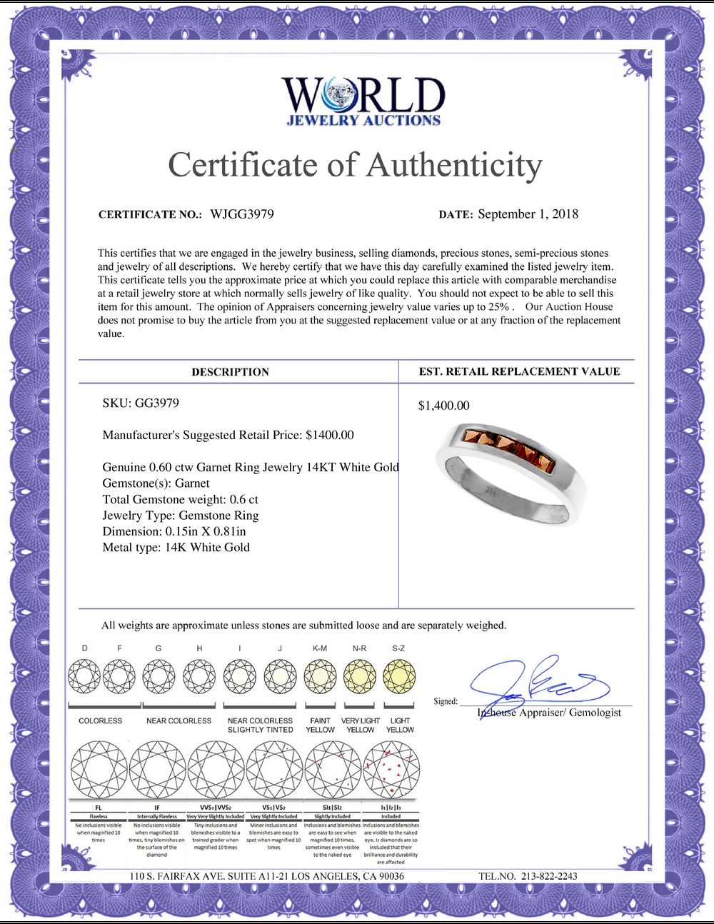 All property is sold “AS IS”, and ALL SALES ARE FINAL. Property is open to thorough public inspection. It is the Bidder’s responsibility to determine condition, age, genuineness, value or any other determinative factor. WJA may attempt to describe the merchandise in advertising and on the Internet but makes no representations. In no event shall WORLD JEWELRY AUCTION be held responsible for having made or implied any warranty of merchantability or fitness for a particular purpose. Bidder shall be the sole judge of value.
