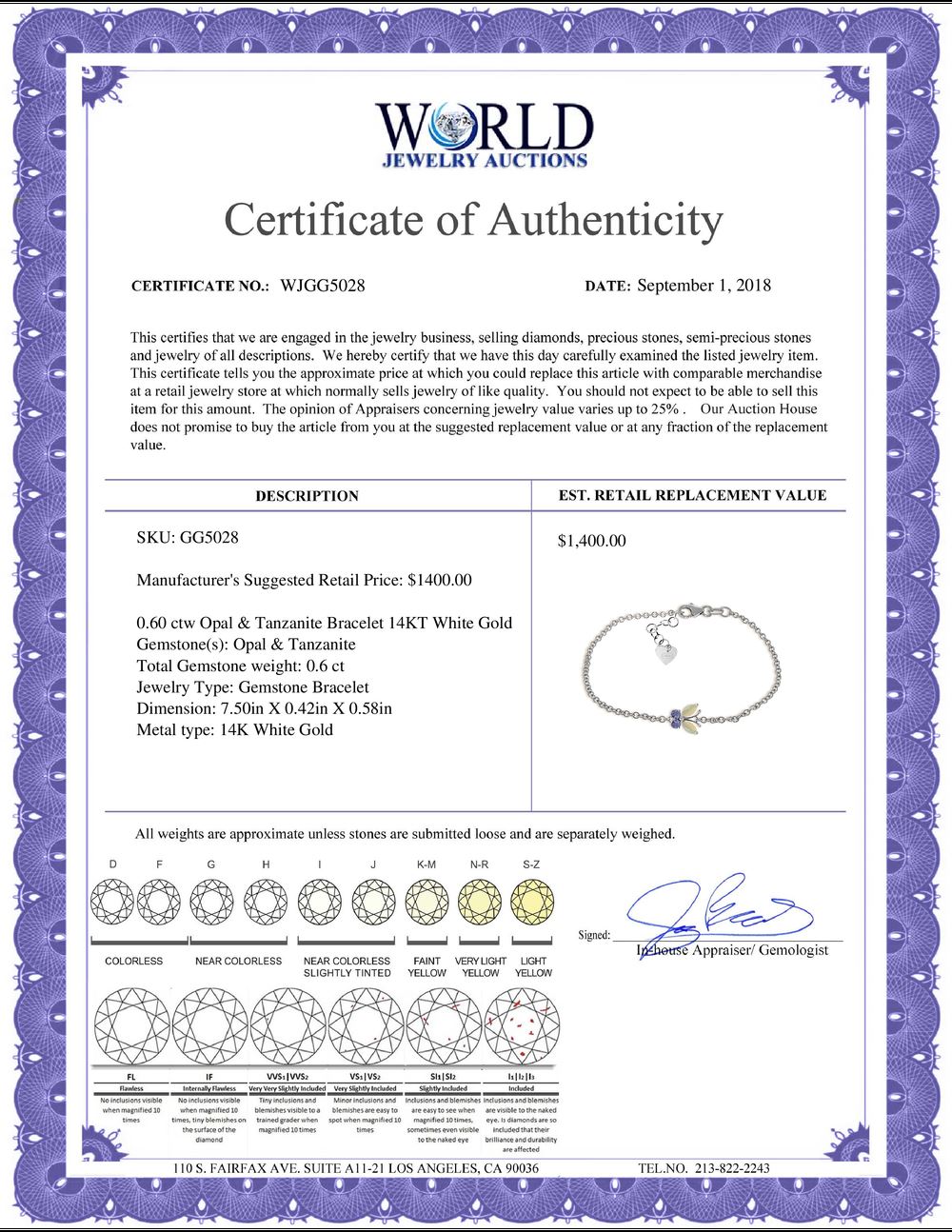 WORLD JEWELRY AUCTION believes to the best of its knowledge that the information presented in any listing has come from reliable sources. Such information is presented solely for the convenience of the Purchaser. WJA makes no warranties of any kind related to the information presented in any listing. WJA further makes no warranties, either express or implied, relating to the value, marketability or condition of the lot described in any listing. Prospective bidders should investigate a lot thoroughly before bidding. By bidding the Bidder acknowledges that Bidder has investigated the lot to his or her satisfaction, or, that Bidder has chosen not to do so, and agrees to accept the lot being bid on with no objections after the sale closes. If you are uncertain please contact us with your questions prior to bidding. If you are still uncertain after we reply, please refrain from bidding. Photos other graphic material contained in any listing of generic or duplicate lots may be stock presentations and not necessarily of the specific lot.