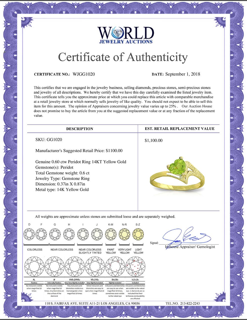 REF-35P9H - SKU: GG1020 ---- Genuine 0.60 ctw Peridot Ring 14KT Yellow Gold