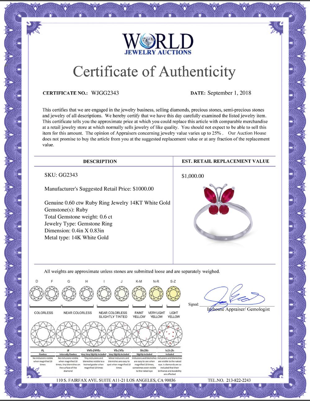 All property is sold “AS IS”, and ALL SALES ARE FINAL. Property is open to thorough public inspection. It is the Bidder’s responsibility to determine condition, age, genuineness, value or any other determinative factor. WJA may attempt to describe the merchandise in advertising and on the Internet but makes no representations. In no event shall WORLD JEWELRY AUCTION be held responsible for having made or implied any warranty of merchantability or fitness for a particular purpose. Bidder shall be the sole judge of value.