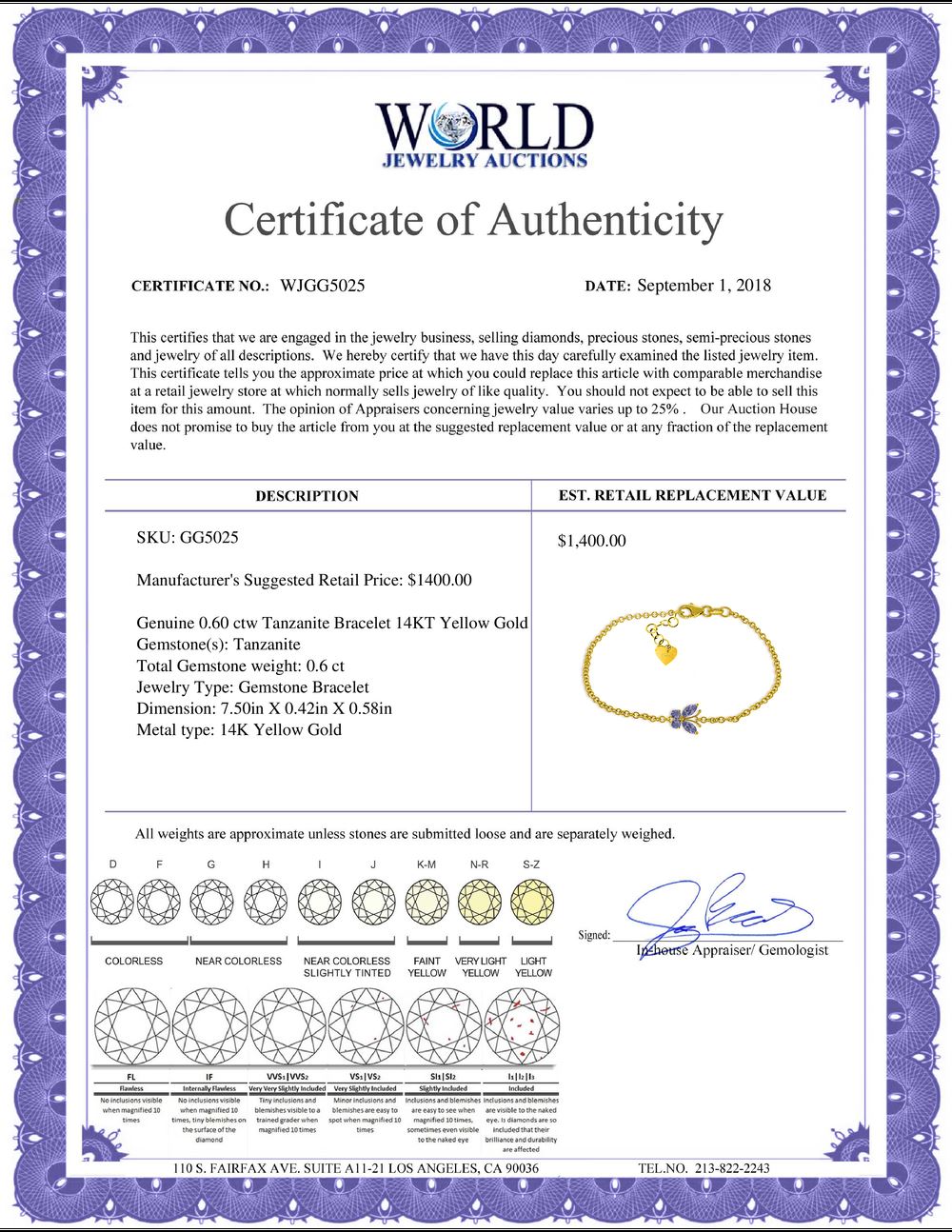 All property is sold “AS IS”, and ALL SALES ARE FINAL. Property is open to thorough public inspection. It is the Bidder’s responsibility to determine condition, age, genuineness, value or any other determinative factor. WJA may attempt to describe the merchandise in advertising and on the Internet but makes no representations. In no event shall WORLD JEWELRY AUCTION be held responsible for having made or implied any warranty of merchantability or fitness for a particular purpose. Bidder shall be the sole judge of value.