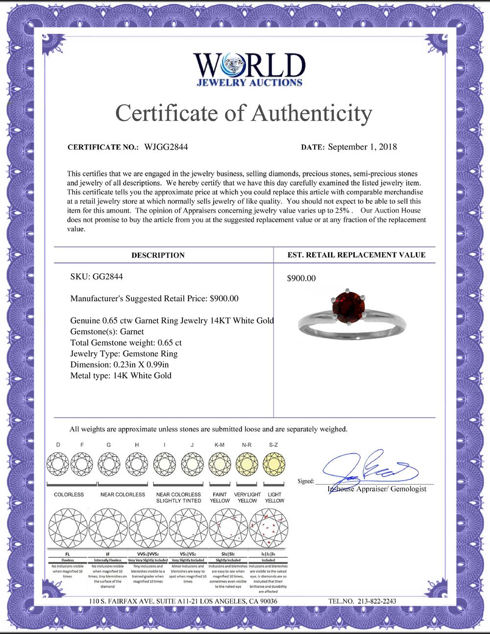 WORLD JEWELRY AUCTION believes to the best of its knowledge that the information presented in any listing has come from reliable sources. Such information is presented solely for the convenience of the Purchaser. WJA makes no warranties of any kind related to the information presented in any listing. WJA further makes no warranties, either express or implied, relating to the value, marketability or condition of the lot described in any listing. Prospective bidders should investigate a lot thoroughly before bidding. By bidding the Bidder acknowledges that Bidder has investigated the lot to his or her satisfaction, or, that Bidder has chosen not to do so, and agrees to accept the lot being bid on with no objections after the sale closes. If you are uncertain please contact us with your questions prior to bidding. If you are still uncertain after we reply, please refrain from bidding. Photos other graphic material contained in any listing of generic or duplicate lots may be stock presentations and not necessarily of the specific lot.