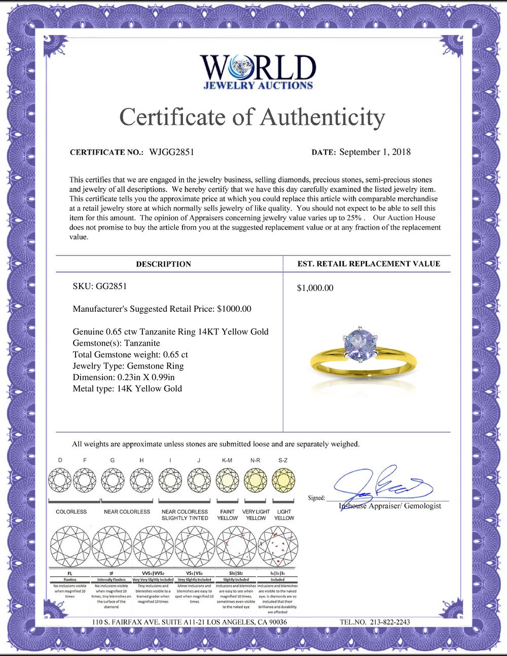 WORLD JEWELRY AUCTION believes to the best of its knowledge that the information presented in any listing has come from reliable sources. Such information is presented solely for the convenience of the Purchaser. WJA makes no warranties of any kind related to the information presented in any listing. WJA further makes no warranties, either express or implied, relating to the value, marketability or condition of the lot described in any listing. Prospective bidders should investigate a lot thoroughly before bidding. By bidding the Bidder acknowledges that Bidder has investigated the lot to his or her satisfaction, or, that Bidder has chosen not to do so, and agrees to accept the lot being bid on with no objections after the sale closes. If you are uncertain please contact us with your questions prior to bidding. If you are still uncertain after we reply, please refrain from bidding. Photos other graphic material contained in any listing of generic or duplicate lots may be stock presentations and not necessarily of the specific lot.