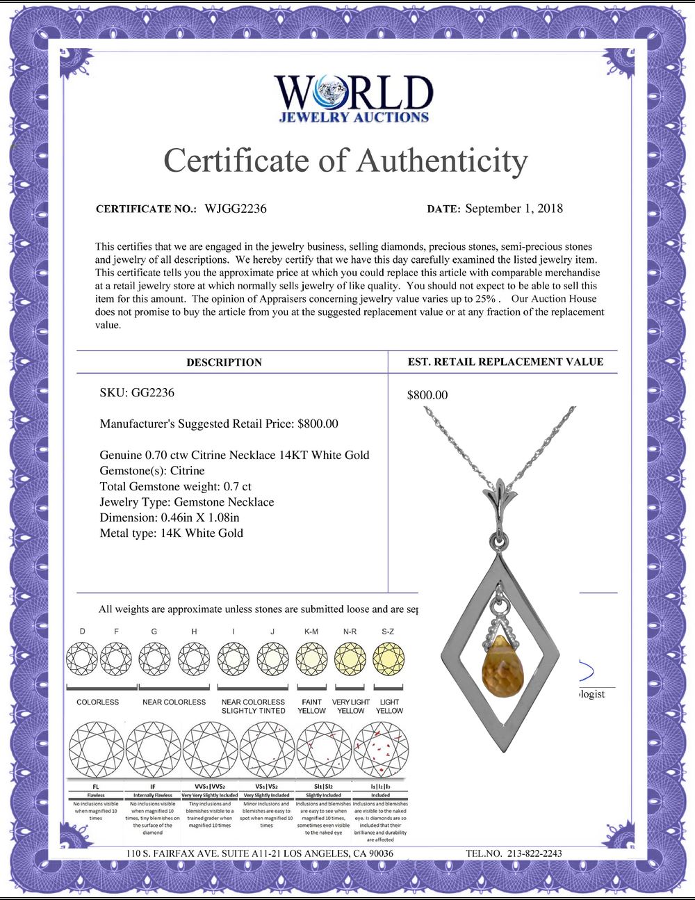 REF-23K9V - SKU: GG2236 ---- Genuine 0.70 ctw Citrine Necklace 14KT White Gold