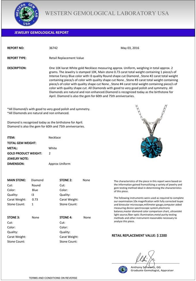 total approx. 2 grams. The Jewelry is stamped 10K, Main stone 0.73 carat total weight containing 1 piece/s of Intense Fancy Blue color with