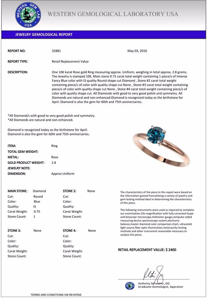 total approx. 2.8 grams. The Jewelry is stamped 10K, Main stone 0.75 carat total weight containing 1 piece/s of Intense Fancy Blue color with