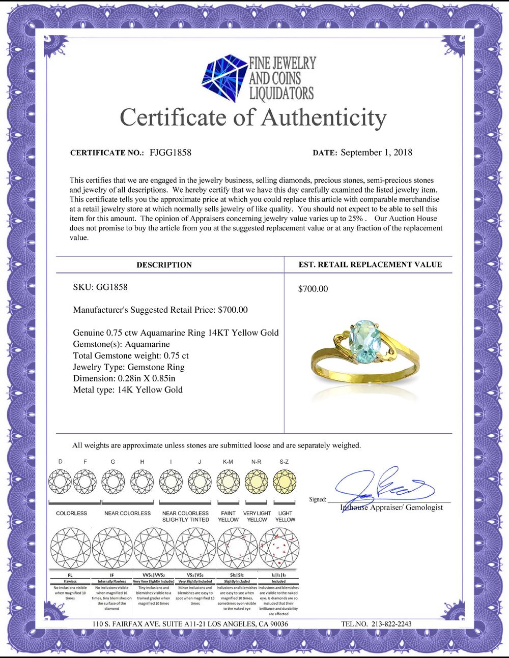 REF-22Y5F - SKU: GG1858 ---- Genuine 0.75 ctw Aquamarine Ring 14KT Yellow Gold