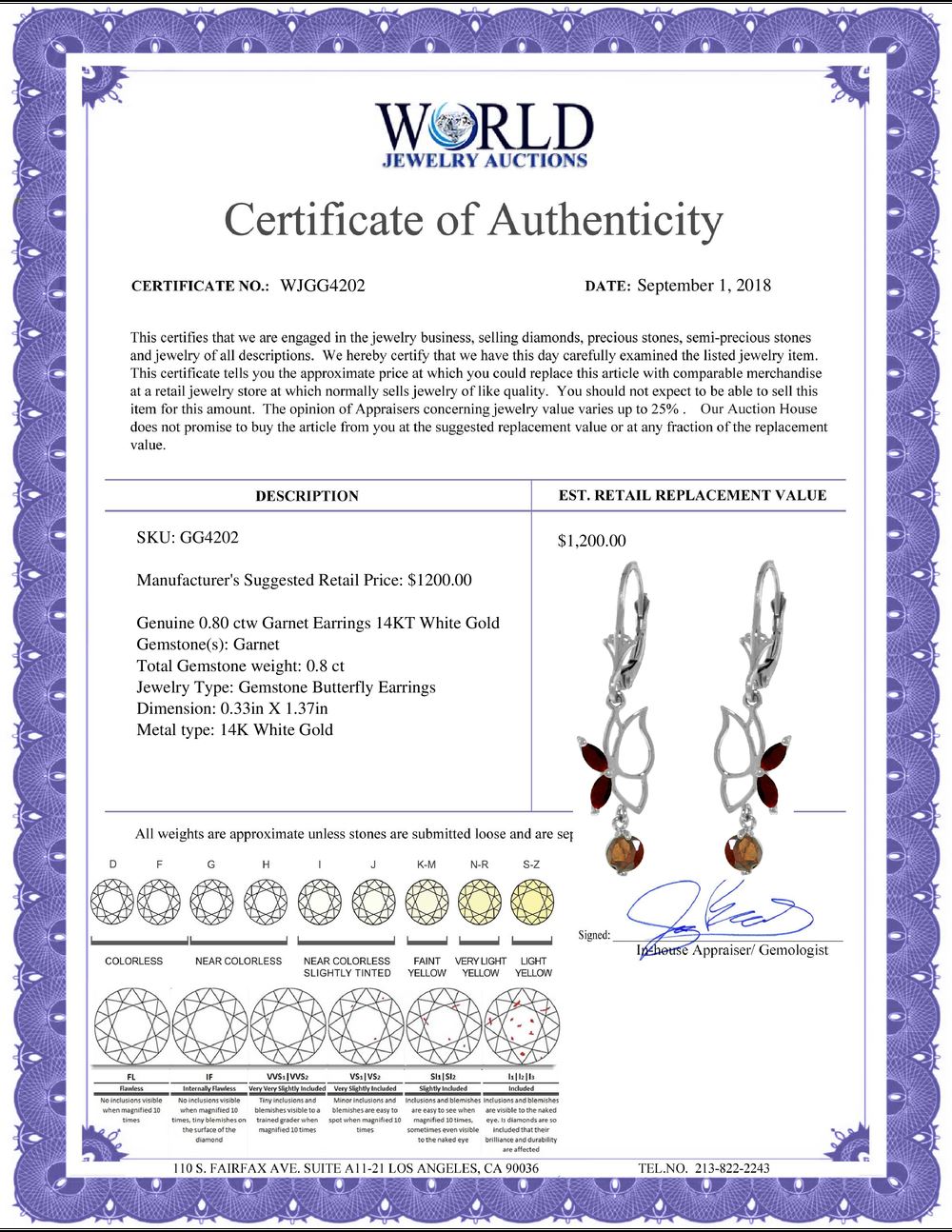 All property is sold “AS IS”, and ALL SALES ARE FINAL. Property is open to thorough public inspection. It is the Bidder’s responsibility to determine condition, age, genuineness, value or any other determinative factor. WJA may attempt to describe the merchandise in advertising and on the Internet but makes no representations. In no event shall WORLD JEWELRY AUCTION be held responsible for having made or implied any warranty of merchantability or fitness for a particular purpose. Bidder shall be the sole judge of value.