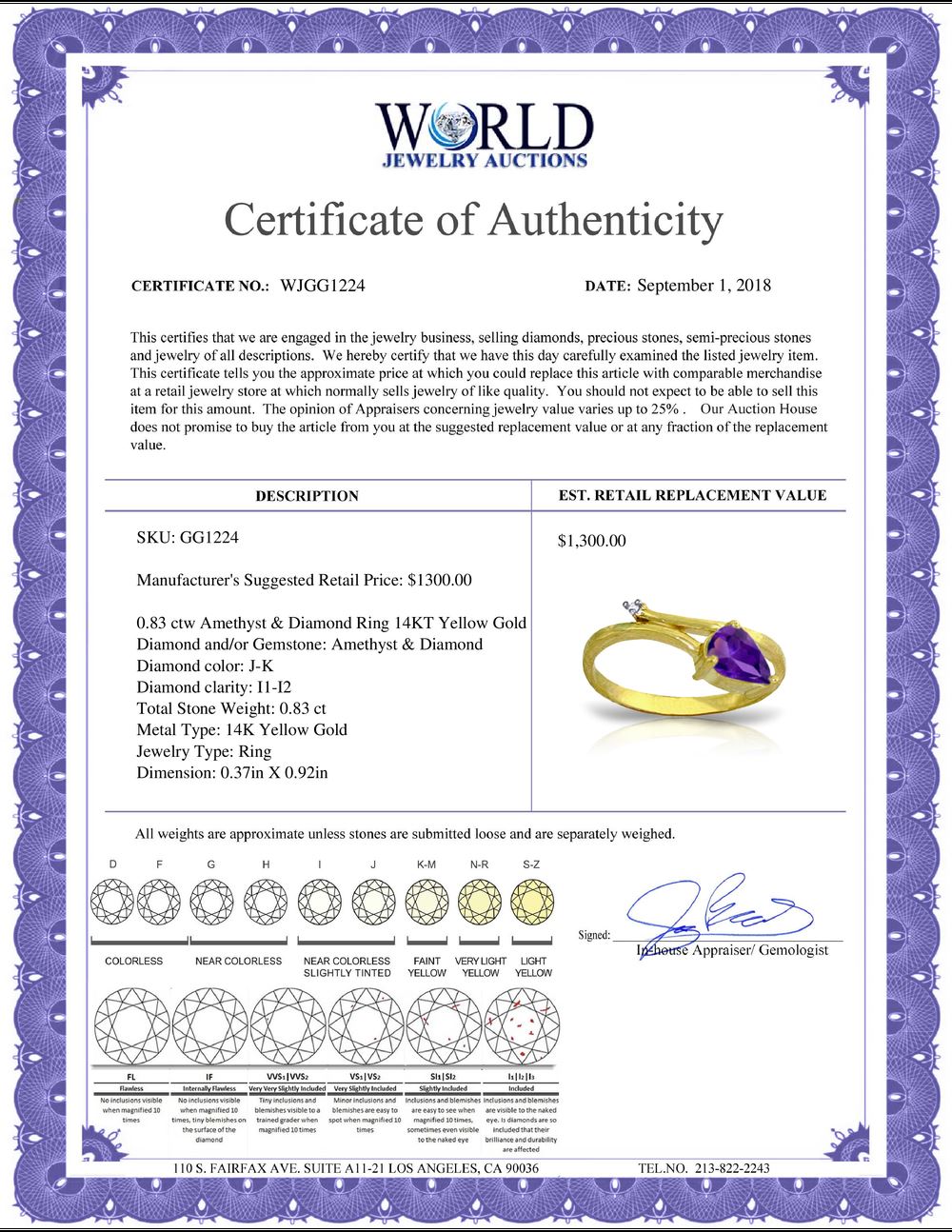 WORLD JEWELRY AUCTION believes to the best of its knowledge that the information presented in any listing has come from reliable sources. Such information is presented solely for the convenience of the Purchaser. WJA makes no warranties of any kind related to the information presented in any listing. WJA further makes no warranties, either express or implied, relating to the value, marketability or condition of the lot described in any listing. Prospective bidders should investigate a lot thoroughly before bidding. By bidding the Bidder acknowledges that Bidder has investigated the lot to his or her satisfaction, or, that Bidder has chosen not to do so, and agrees to accept the lot being bid on with no objections after the sale closes. If you are uncertain please contact us with your questions prior to bidding. If you are still uncertain after we reply, please refrain from bidding. Photos other graphic material contained in any listing of generic or duplicate lots may be stock presentations and not necessarily of the specific lot.