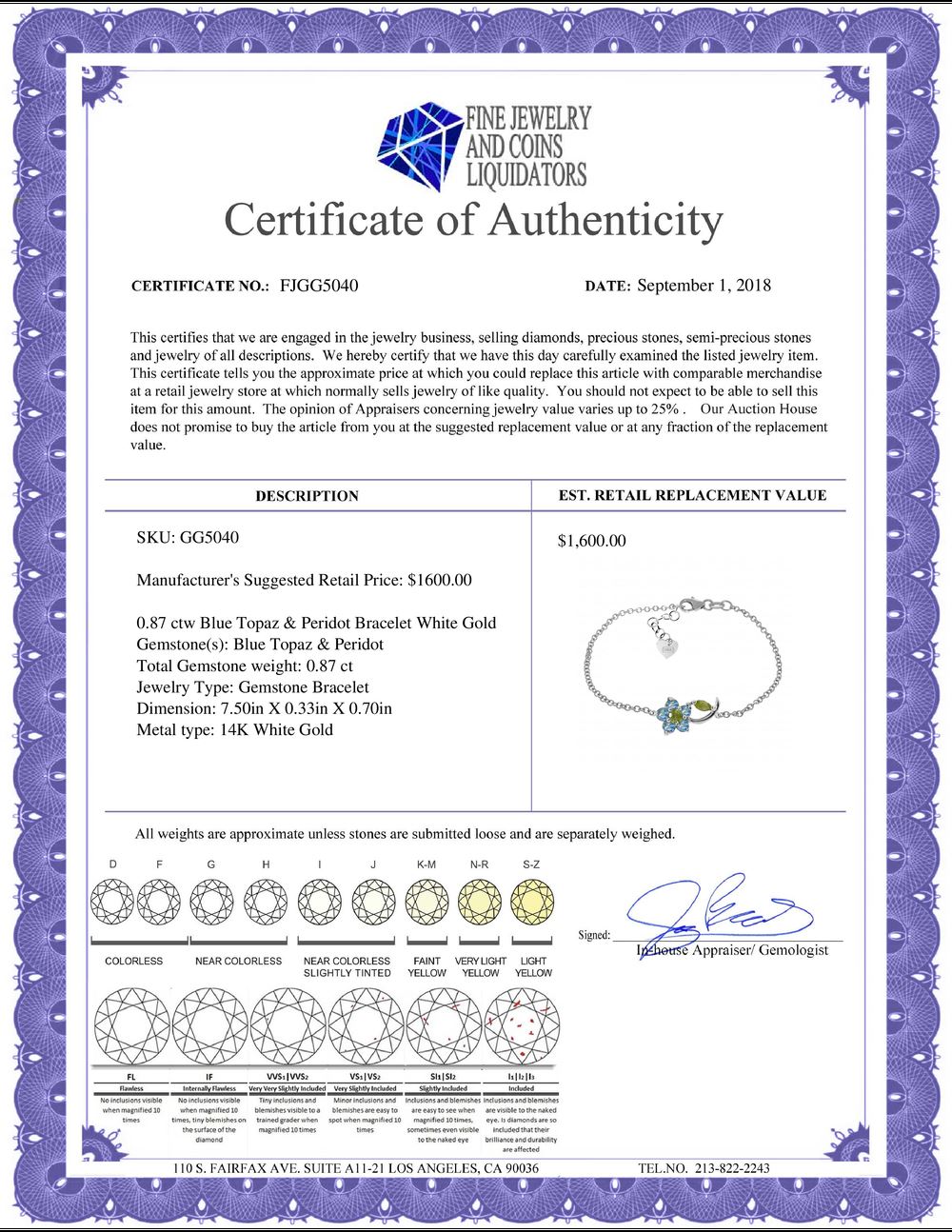 REF-50M5T - SKU: GG5040 ---- Genuine 0.87 ctw Blue Topaz & Peridot Bracelet 14KT White Gold