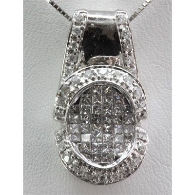 Genuine 0.90 ctw Invisible Pendant w/ Round Diamond 18k **|**|** Total CTW: 0.9 ; Jewelry Type: Pendant32 round cut, 36 square cut ; Weight(g): 7.05 ; Metal Purity: 18k White Gold ; MSRP: $3054