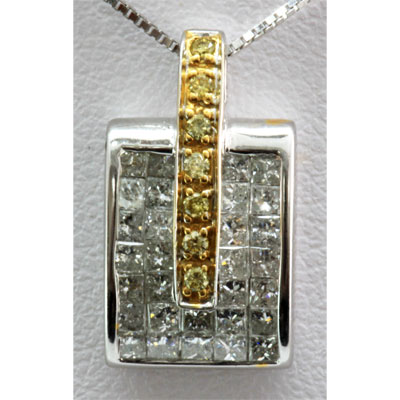 Total CTW: 0.92 ; Style: Pendant ; Diamond Count 1: 30 square, 7 round ; Weight(g): 3.44 ; Metal Purity: 14k Yellow-White Gold; Availability: 3-10 Business days, ready to ship, with certification of appraisal will take 2 weeks. ; MSRP: $2328