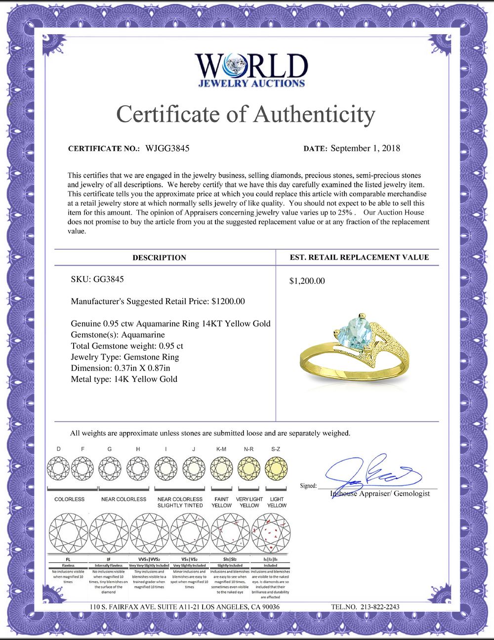 REF-39H3X - SKU: GG3845 ---- Genuine 0.95 ctw Aquamarine Ring 14KT Yellow Gold