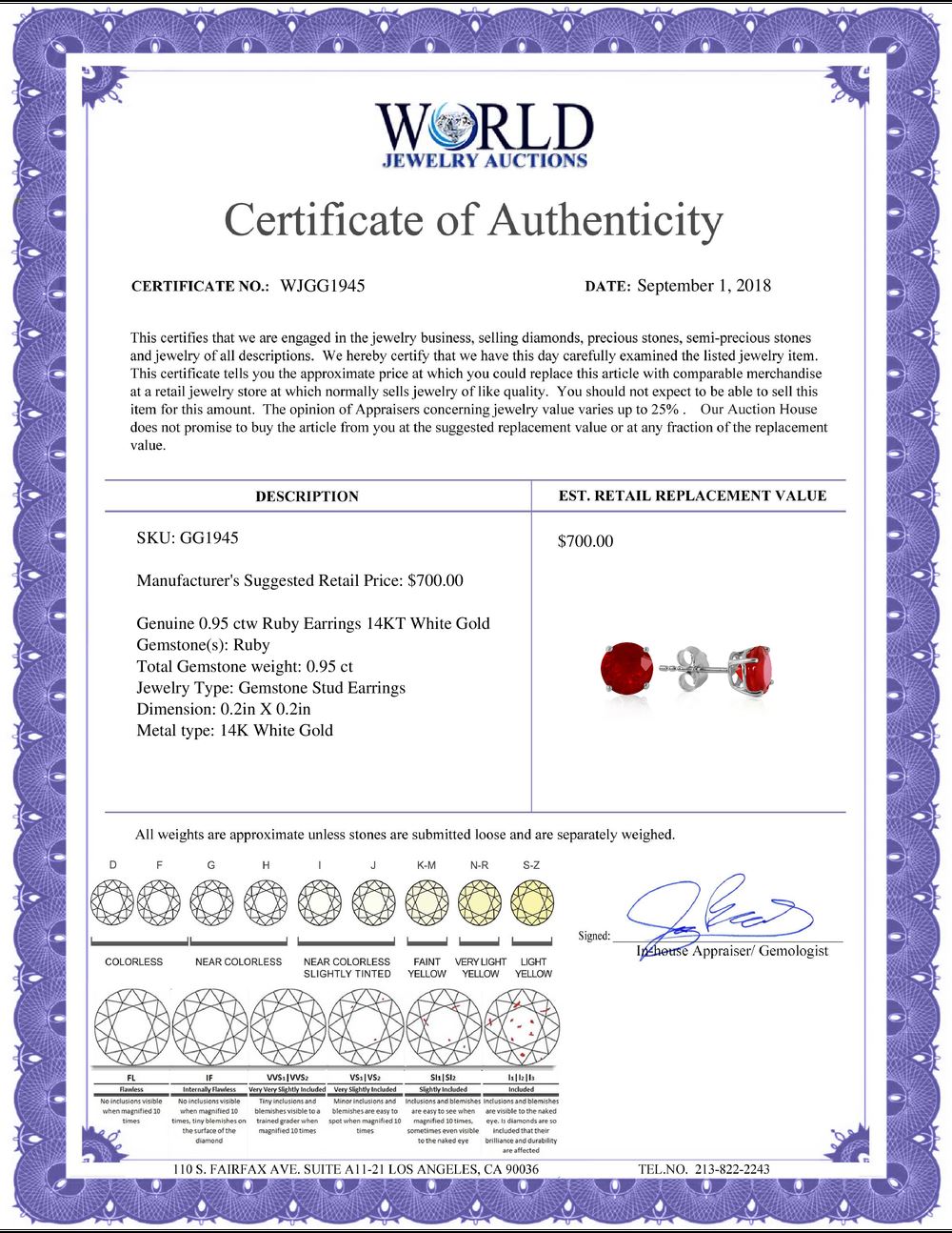 REF-20M4T - SKU: GG1945 ---- Genuine 0.95 ctw Ruby Earrings 14KT White Gold