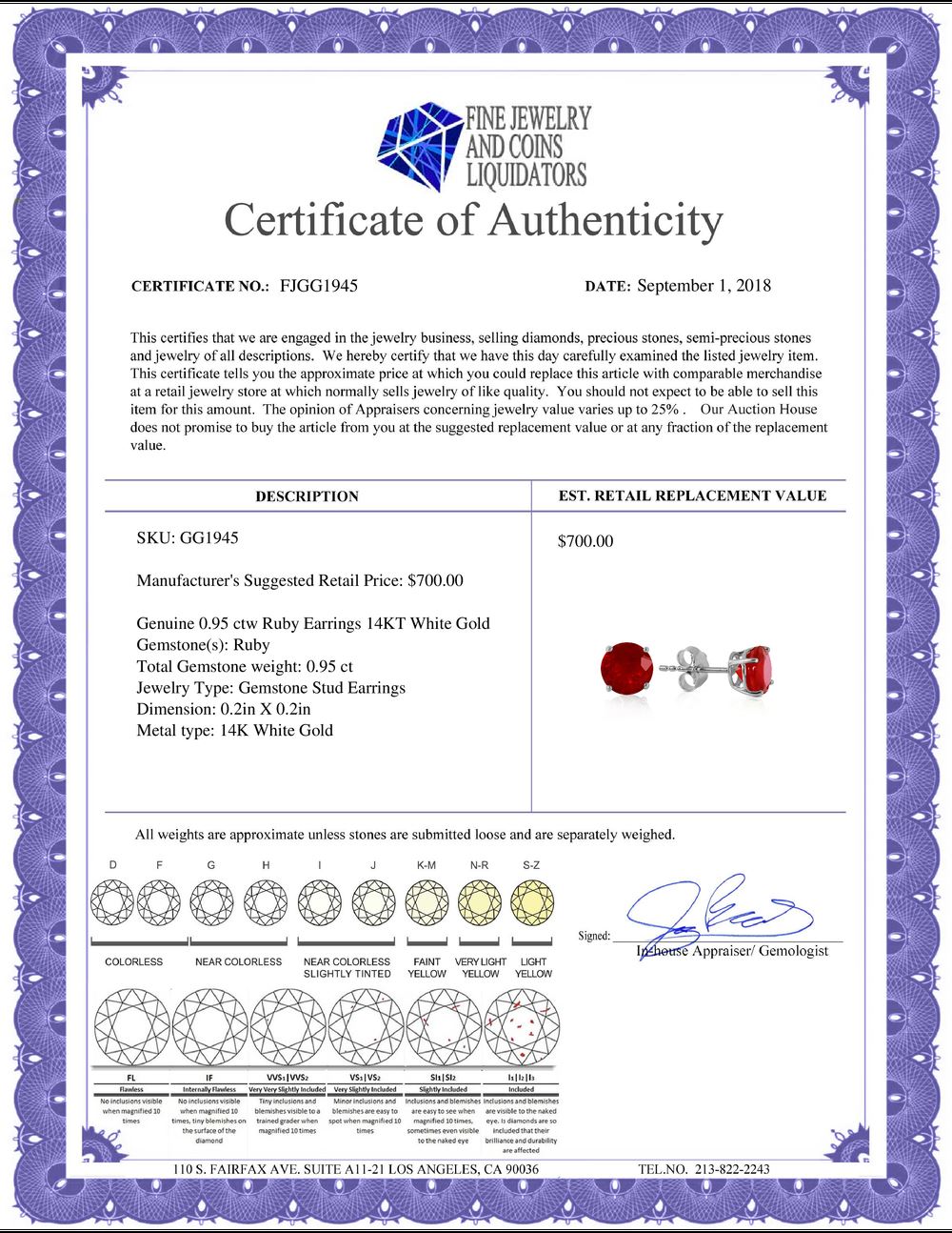 REF-20M4T - SKU: GG1945 ---- Genuine 0.95 ctw Ruby Earrings 14KT White Gold