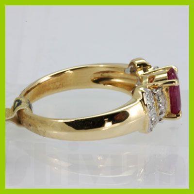 Gemstone: Ruby ; Gemstone Shape: Oval ; Gemstone Size: 6X4 ; Gemstone Weight: 0.77 ; Diamond Count: 8RD ; Diamond Weight: 0.22; Metal Purity: 14KT ; Metal: Yellow Gold ; Ring Size: 6.5