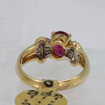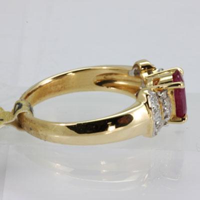 Gemstone: Ruby ; Gemstone Shape: Oval ; Gemstone Size: 6X4 ; Gemstone Weight: 0.77 ; Diamond Count: 8RD ; Diamond Weight: 0.22; Metal Purity: 14KT ; Metal: Yellow Gold ; Ring Size: 6.5