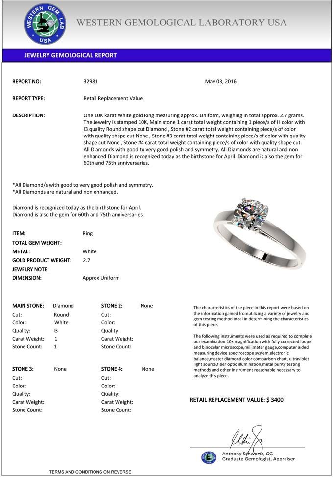 total approx. 2.7 grams. The Jewelry is stamped 10K, Main stone 1 carat total weight containing 1 piece/s of H color with