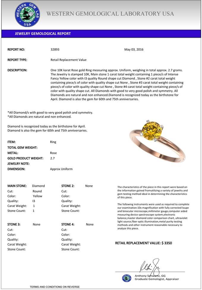 total approx. 2.7 grams. The Jewelry is stamped 10K, Main stone 1 carat total weight containing 1 piece/s of Intense Fancy Yellow color with
