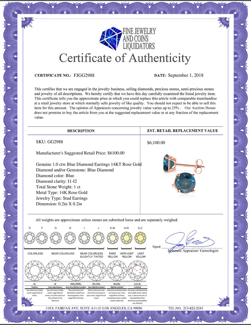 REF-202F2Z - SKU: GG2988 ---- Genuine 1.0 ctw Blue Diamond Earrings 14KT Rose Gold