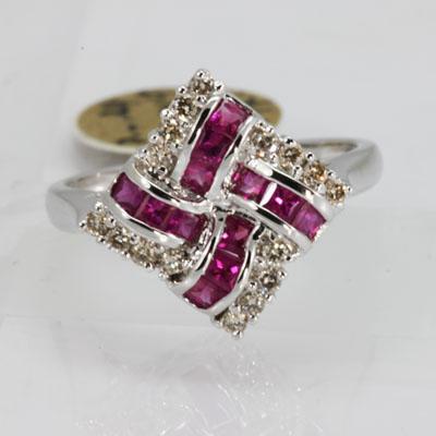 Gemstone: Ruby ; Gemstone Weight: 0.764 ; Diamond Count: 12RD ; Diamond Weight: 0.24; Metal Purity: 14KT ; Metal: White Gold ; Ring Size: 6.5