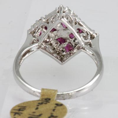 Gemstone: Ruby ; Gemstone Weight: 0.764 ; Diamond Count: 12RD ; Diamond Weight: 0.24; Metal Purity: 14KT ; Metal: White Gold ; Ring Size: 6.5