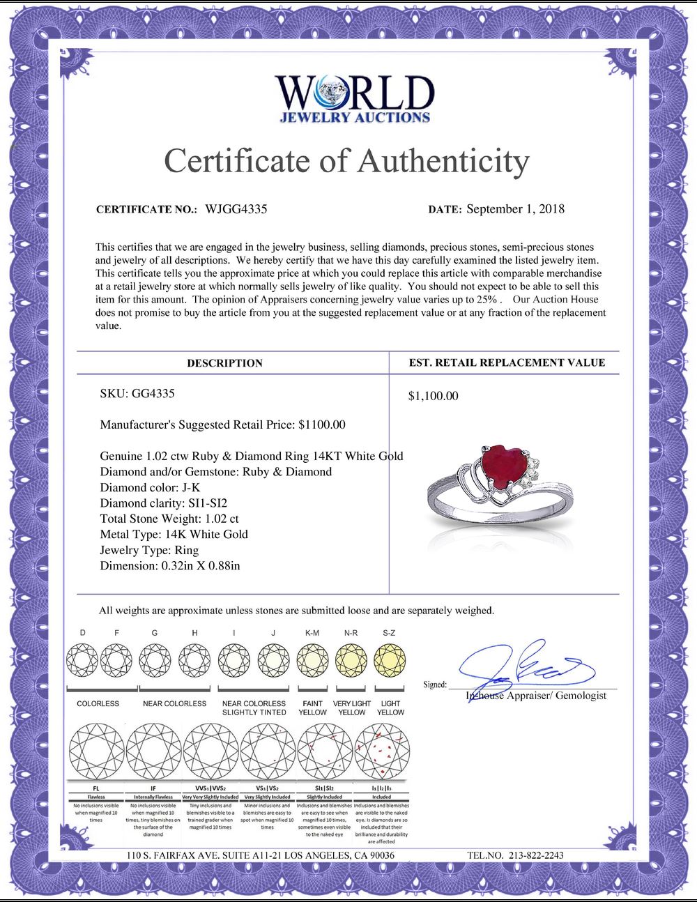 All property is sold “AS IS”, and ALL SALES ARE FINAL. Property is open to thorough public inspection. It is the Bidder’s responsibility to determine condition, age, genuineness, value or any other determinative factor. WJA may attempt to describe the merchandise in advertising and on the Internet but makes no representations. In no event shall WORLD JEWELRY AUCTION be held responsible for having made or implied any warranty of merchantability or fitness for a particular purpose. Bidder shall be the sole judge of value.