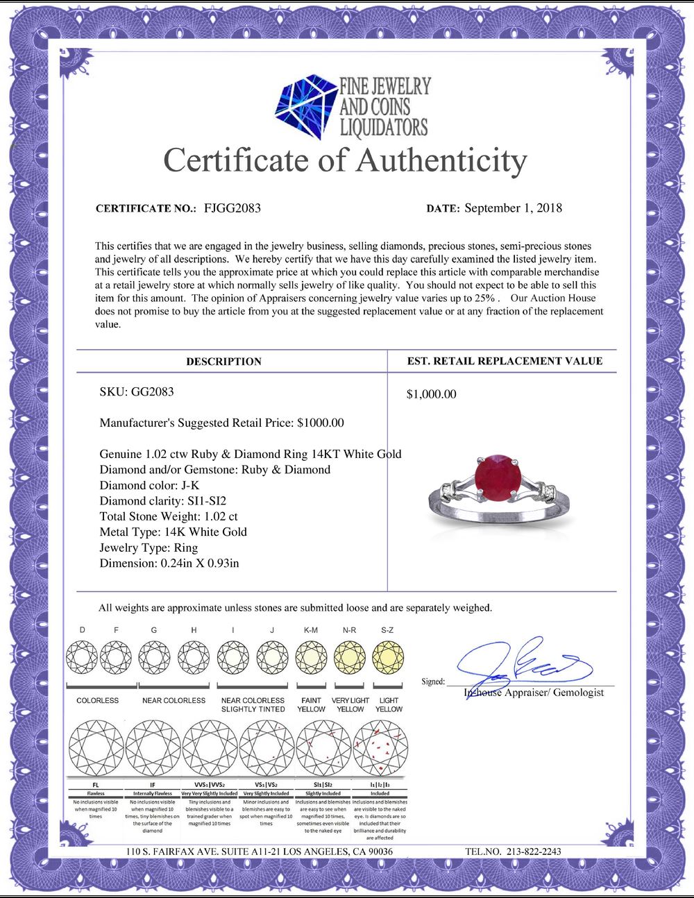 REF-30T9A ---- SKU:GG-2083 ---- Manufacturer's Suggested Retail Price: $1000.00 ---- Genuine 14K Yellow Gold 1.02 ctw Ruby & Diamond Ring