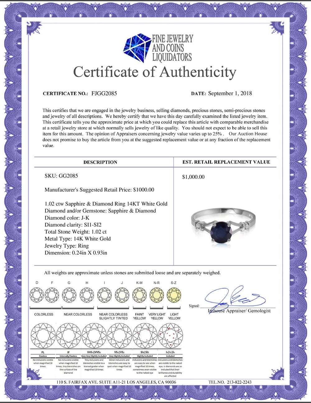 REF-30N9R - SKU: GG2085 ---- Genuine 1.02 ctw Sapphire & Diamond Ring 14KT White Gold