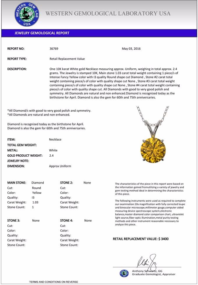 total approx. 2.4 grams. The Jewelry is stamped 10K, Main stone 1.03 carat total weight containing 1 piece/s of Intense Fancy Yellow color with