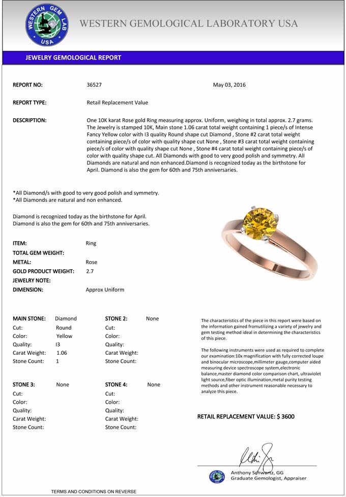 total approx. 2.7 grams. The Jewelry is stamped 10K, Main stone 1.06 carat total weight containing 1 piece/s of Intense Fancy Yellow color with
