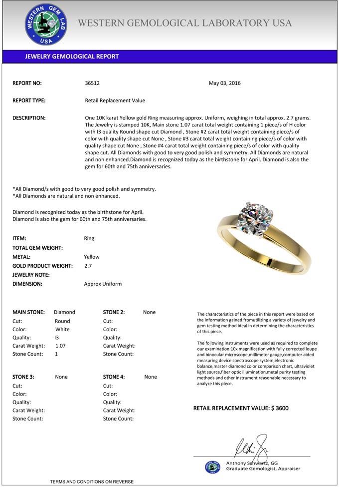 total approx. 2.7 grams. The Jewelry is stamped 10K, Main stone 1.07 carat total weight containing 1 piece/s of H color with