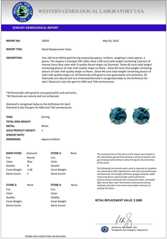 total approx. 2 grams. The Jewelry is stamped 10K, Main stone 1.08 carat total weight containing 2 piece/s of Intense Fancy Blue color with