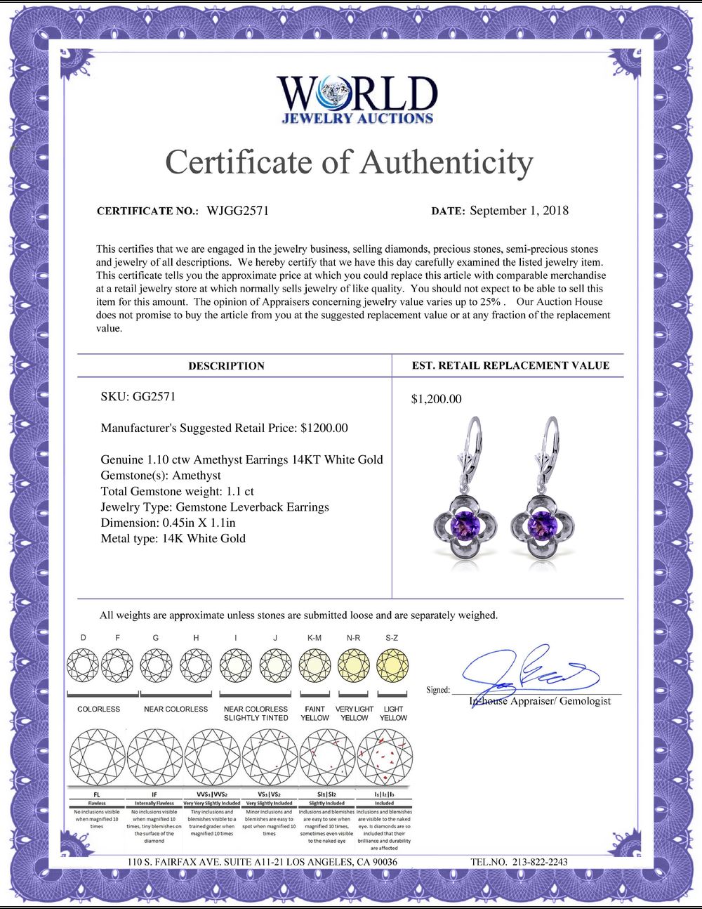 REF-37H7X - SKU: GG2571 ---- Genuine 1.10 ctw Amethyst Earrings 14KT White Gold